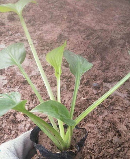 根狀莖粗大,白色,并生有許多須根,株高50厘米~70厘米,葉基生,大型,葉片卵形至心形,有長柄,有多數平行葉脈。 頂生總狀花序,花梗自葉叢中抽出,高出葉面,有花10朵~15朵,花潔白色或紫色,漏斗狀,有濃香,花期6月~9月。